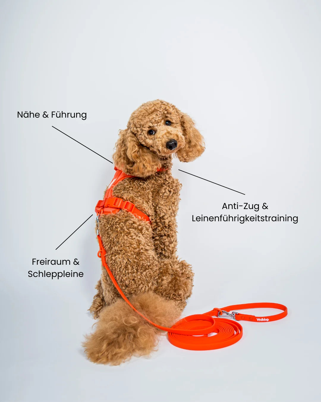 Gefertigt aus leichtem Neoprenmaterial mit einer innenliegenden, atmungsaktiven Mesh-Polsterung, bietet das Welldog. Geschirr ein Tragegefühl, das so angenehm ist, dass dein Hund es kaum bemerkt. Die Karbonstahl D-Ringe, farblich beschichtet und ebenso leicht wie robust, garantieren maximale Bewegungsfreiheit und Langlebigkeit – perfekt für Hunde, die sich gerne frei bewegen.