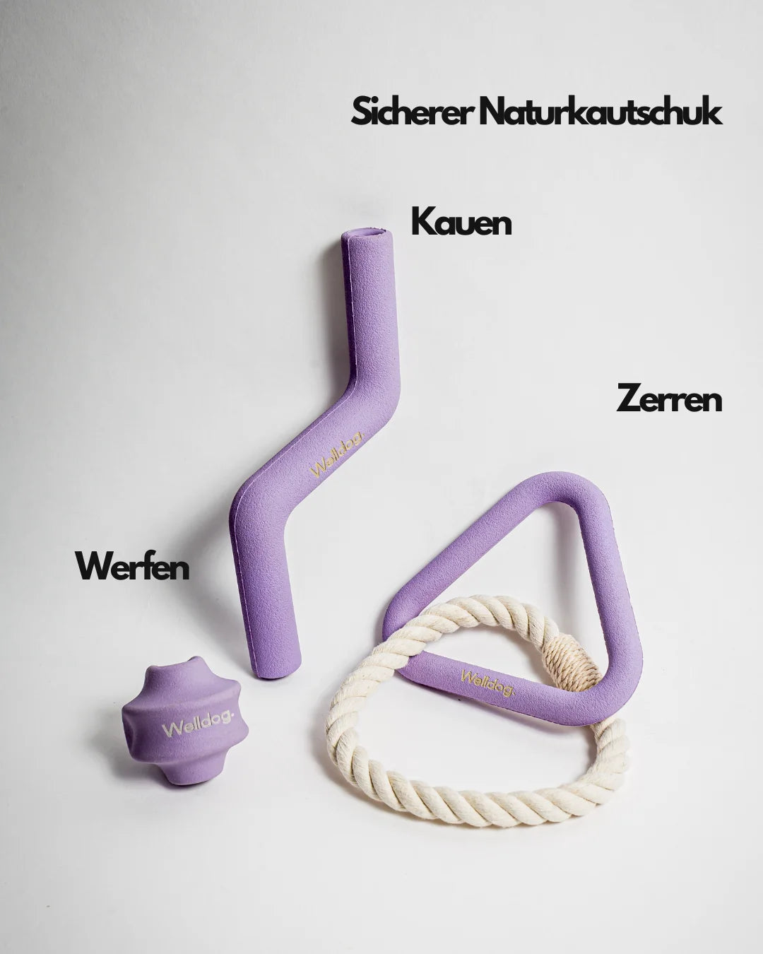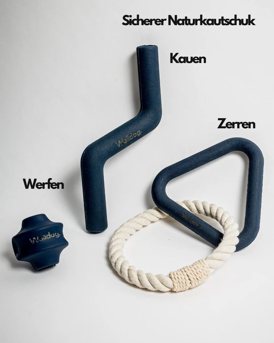 - 3 Spielzeuge aus Naturkautschuk – zum Kauen, Apportieren, Beschäftigen.