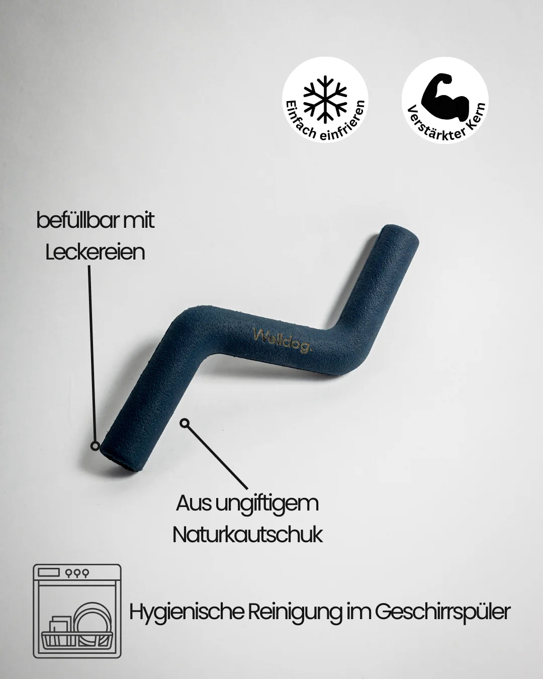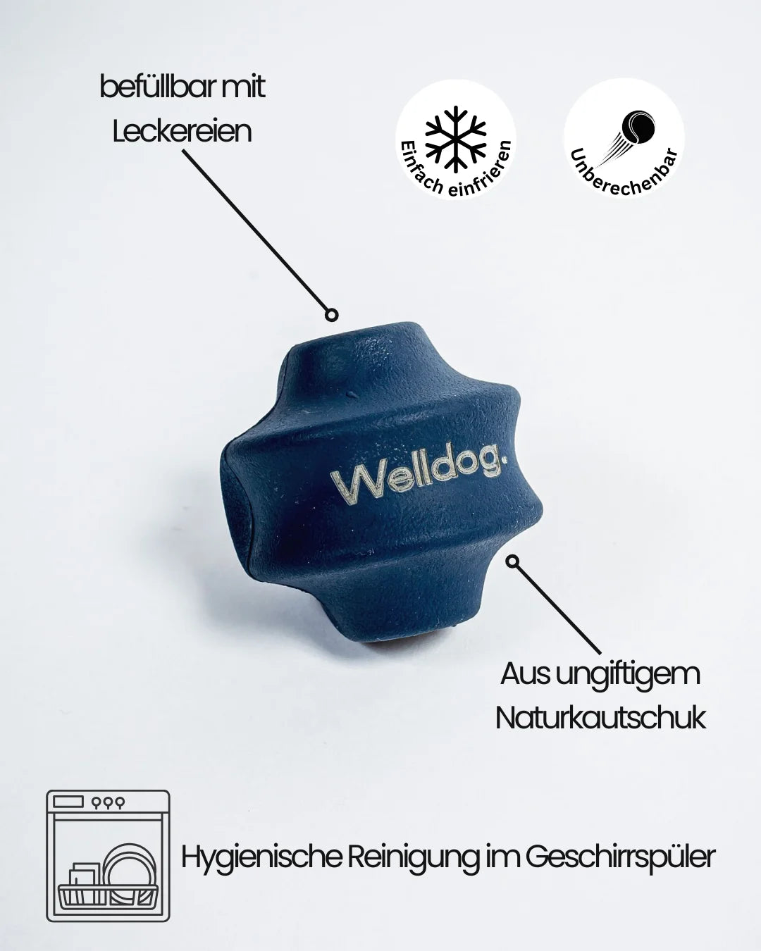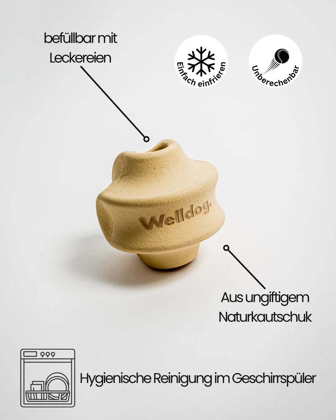 Robust, massiv und trotzdem fein im Handling. Zwei Öffnungen ermöglichen das Befüllen mit Leckerlis – oder das einfache Festhalten beim Kauen.