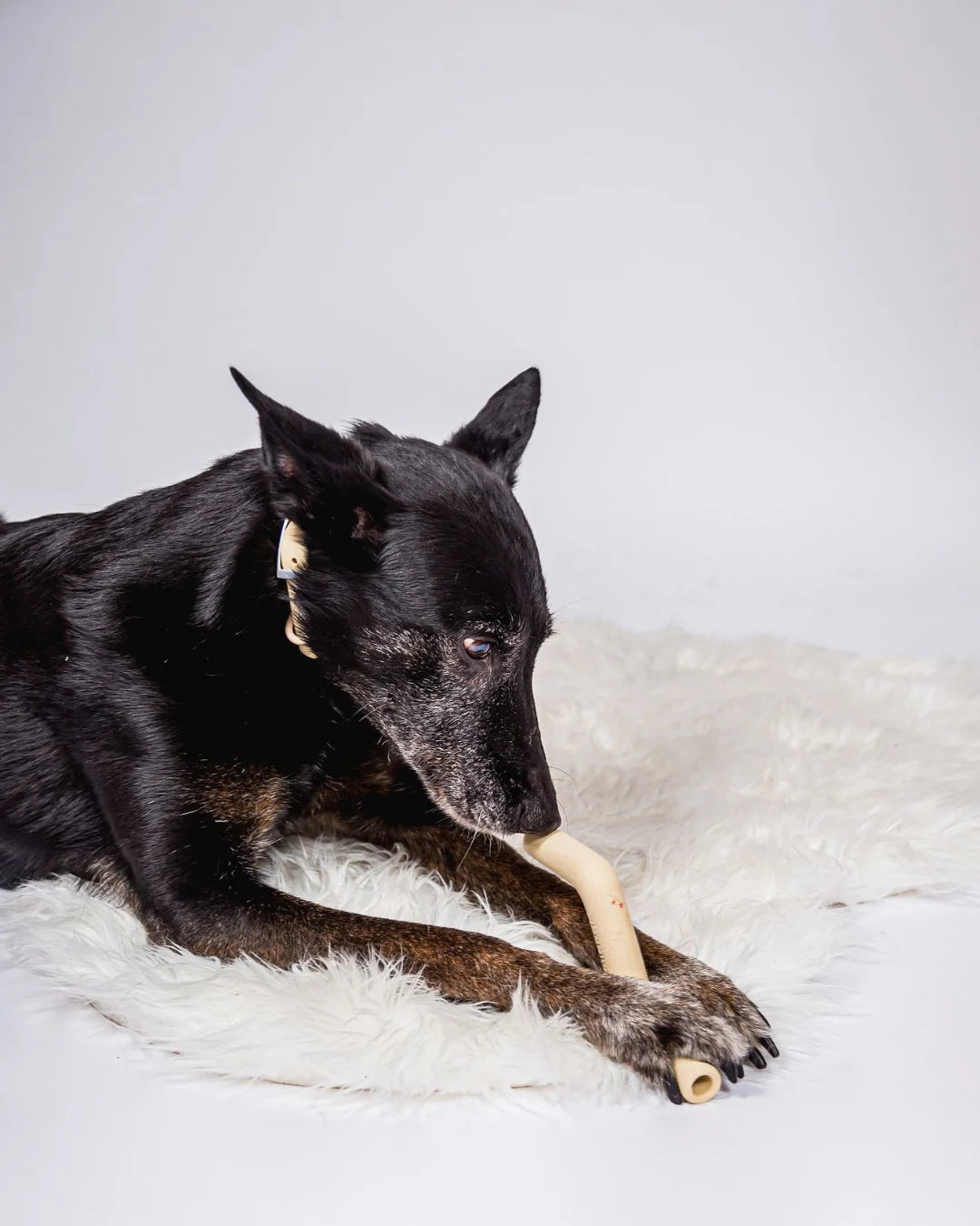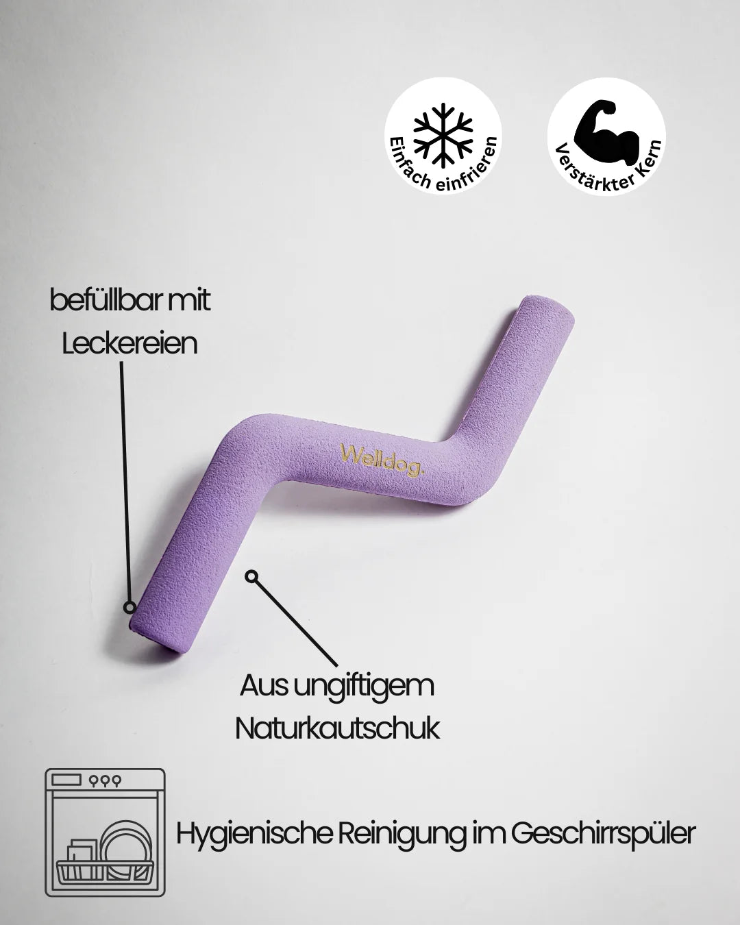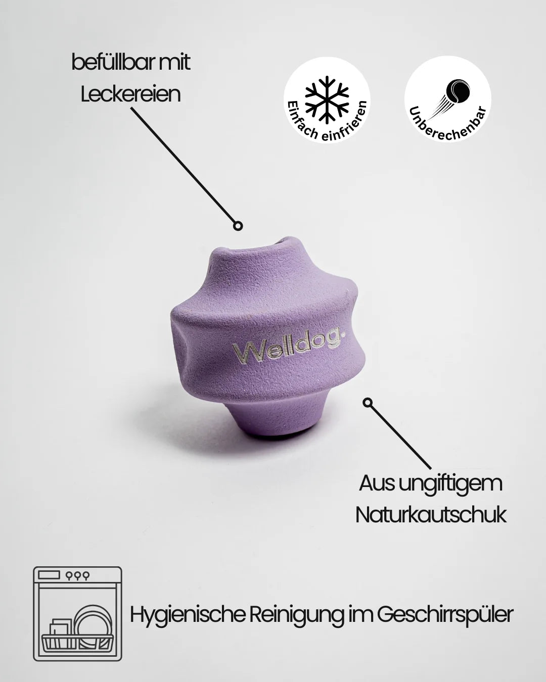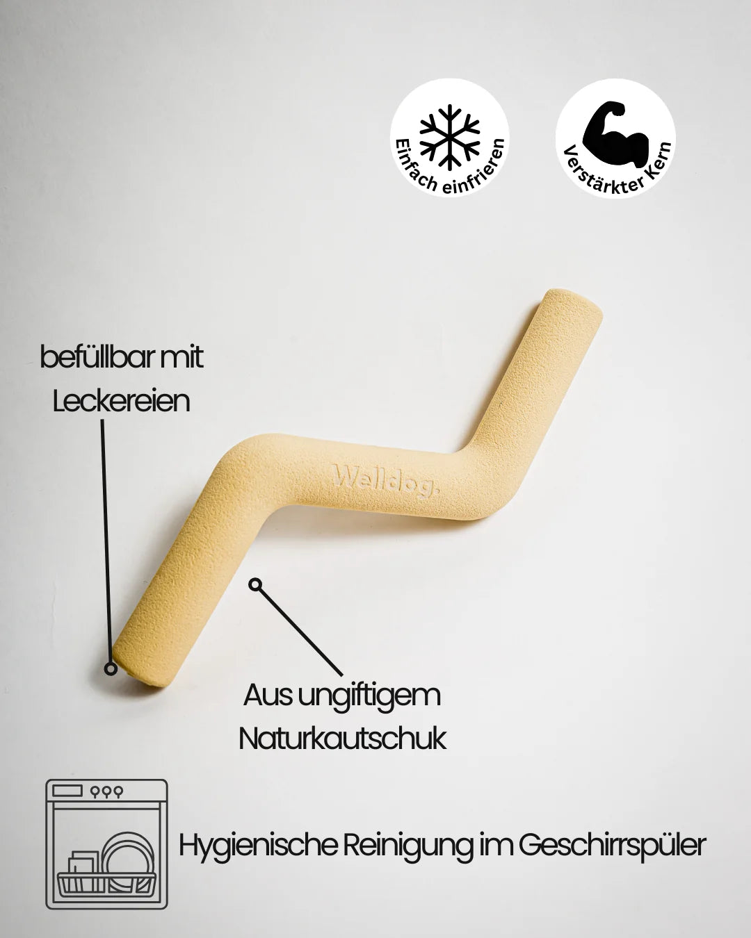 Robust, massiv und trotzdem fein im Handling. Zwei Öffnungen ermöglichen das Befüllen mit Leckerlis – oder das einfache Festhalten beim Kauen.