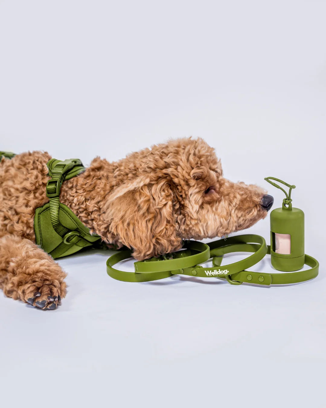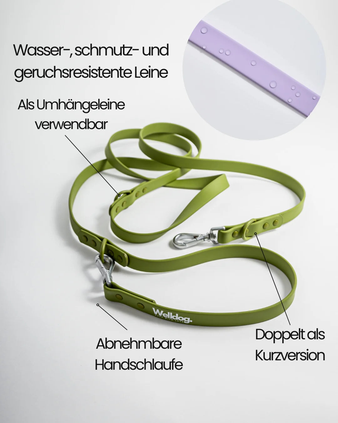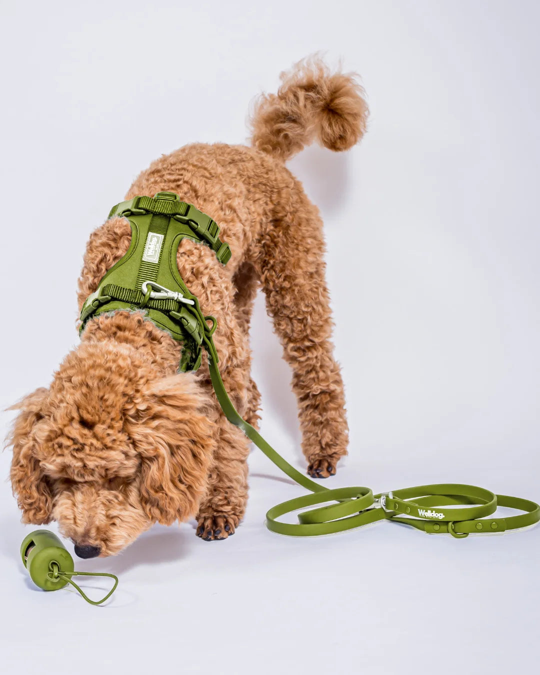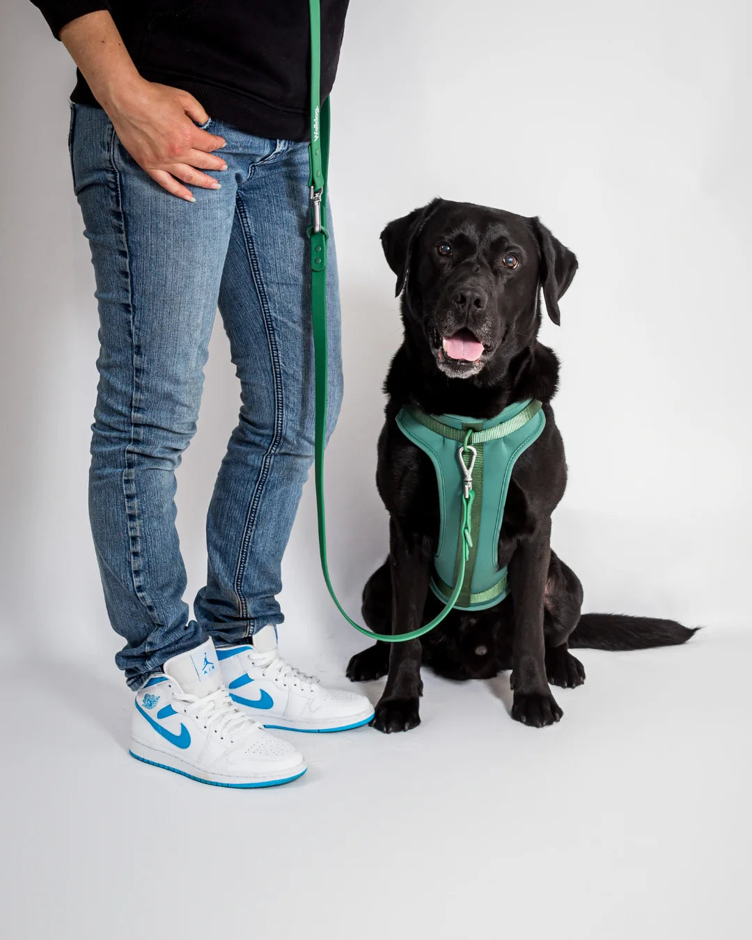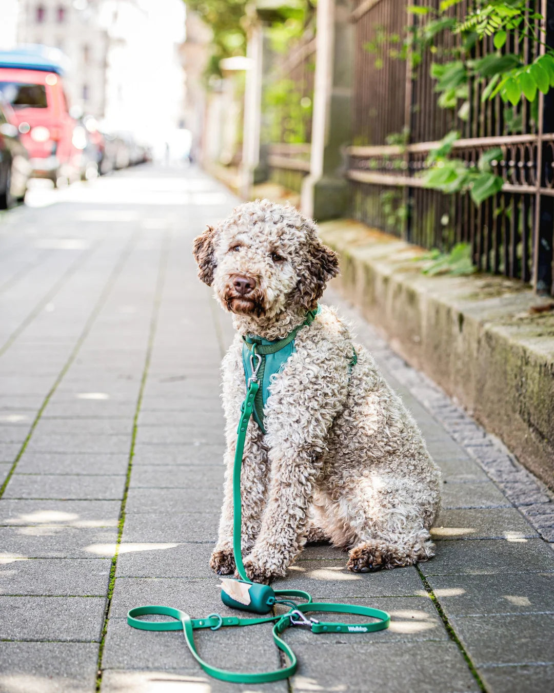 Die Leine und der Poop-Bag-Spender bestehen ebenfalls aus recyceltem Material.