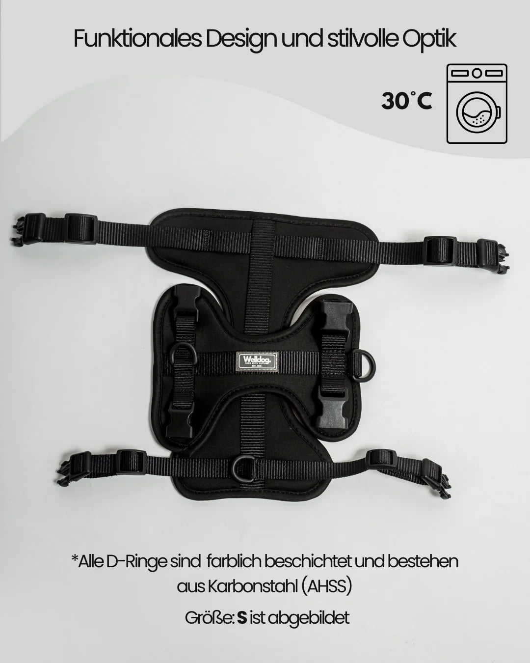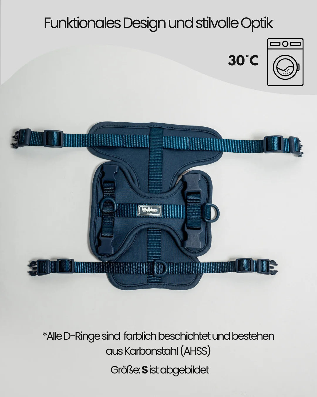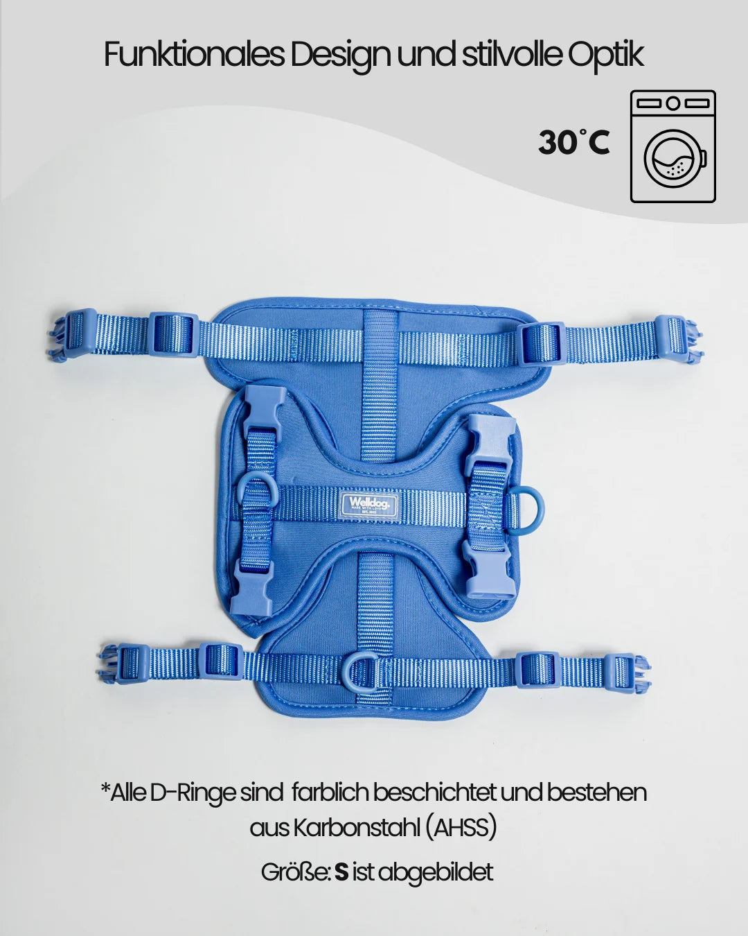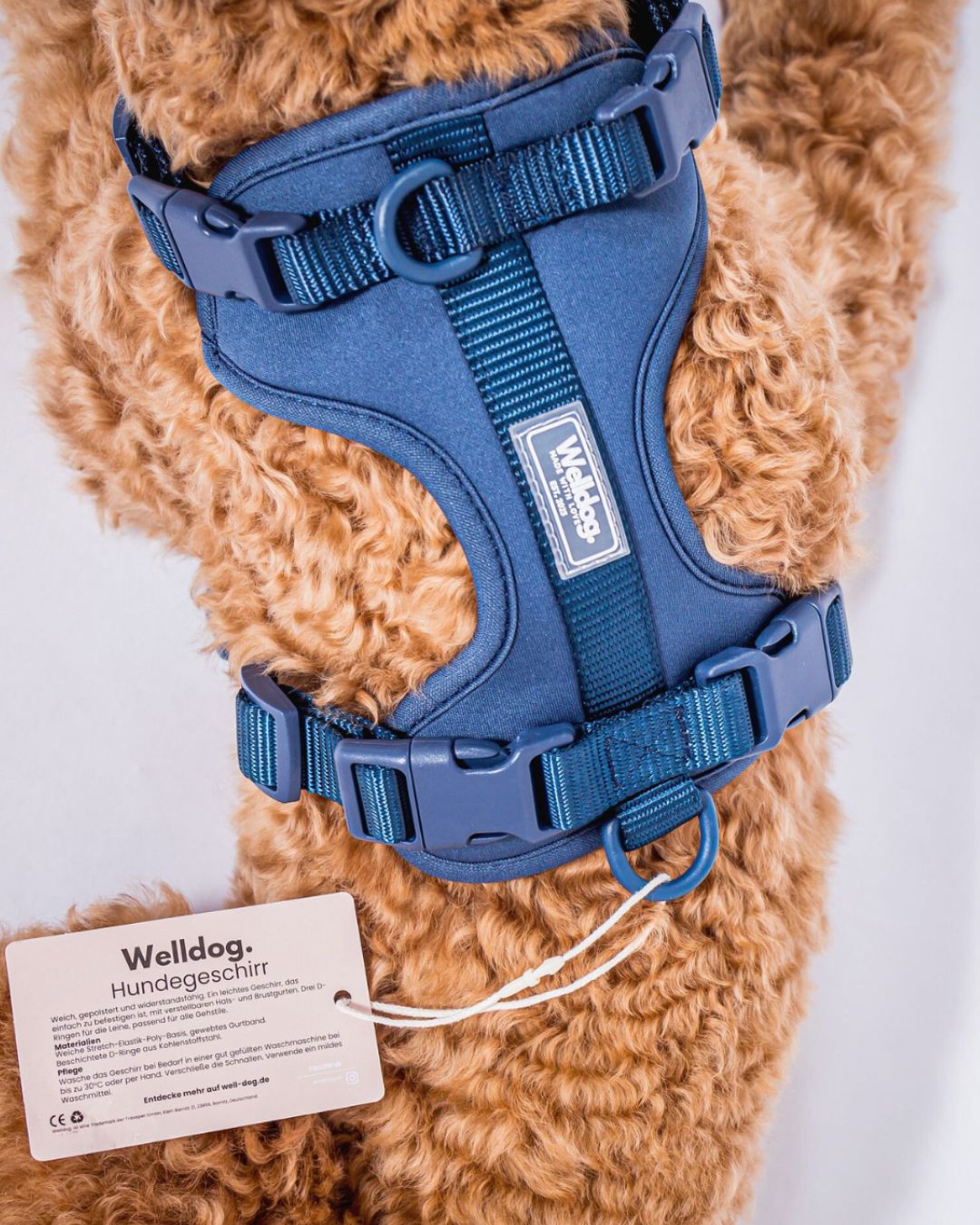 Gefertigt aus leichtem Neoprenmaterial mit einer innenliegenden, atmungsaktiven Mesh-Polsterung, bietet das Welldog. Geschirr ein Tragegefühl, das so angenehm ist, dass dein Hund es kaum bemerkt. Die Karbonstahl D-Ringe, farblich beschichtet und ebenso leicht wie robust, garantieren maximale Bewegungsfreiheit und Langlebigkeit – perfekt für Hunde, die sich gerne frei bewegen.